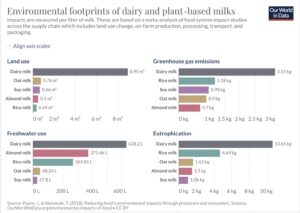 - Dairy vs. plant-based milk: what are the environmental impacts? The University of Oxford, Our World in Data Research Group, Hannah Ritche, Jan 19, 2022[1]Dairy vs. plant-based milk: what are the environmental impacts? The University of Oxford, Our World in Data Research Group, Hannah Ritche, Jan 19, 2022