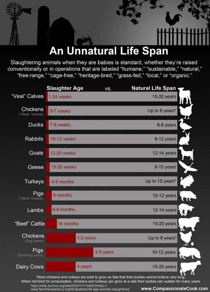 The notes on this page demonstrate that farmed animals are slaughtered after living a small fraction of their natural lifespans, in violation of their rights.